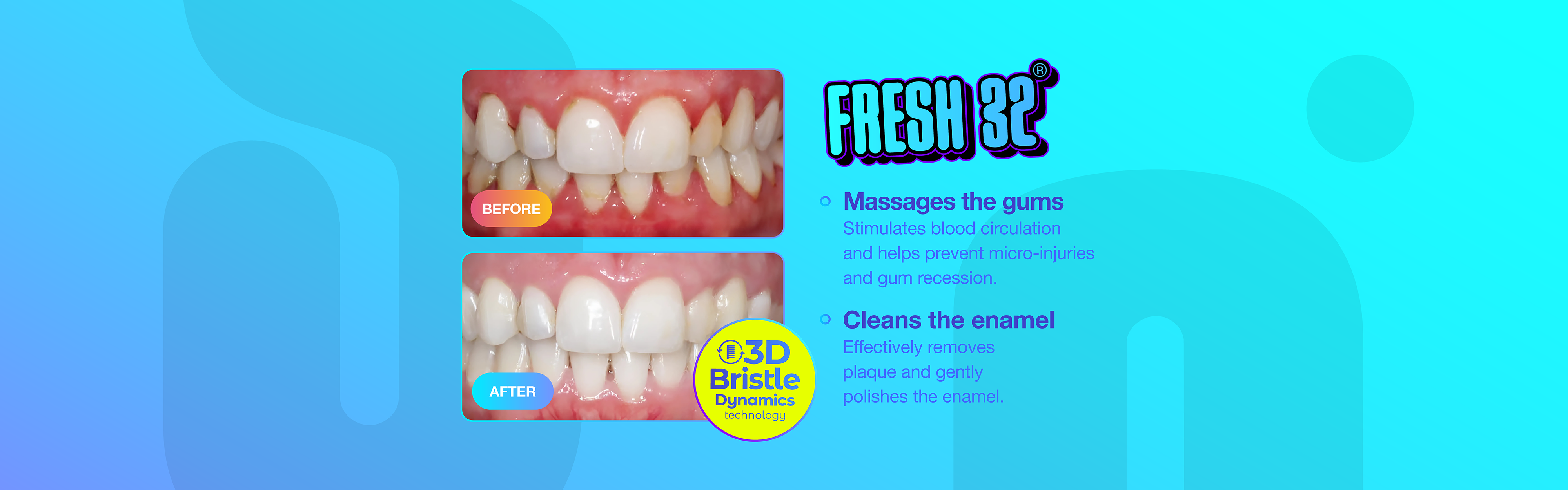 Imagine brushing your teeth feeling more like a soothing ritual than a routine chore. That’s what FRESH 32 is all about – comfort, freshness, and an effortless clean. Our TPU bristles gently massage your gums while effectively removing plaque, leaving your mouth feeling clean, polished, and revitalized – without any irritation or discomfort. You’ll notice the difference right away: smoother enamel, fresher breath, and a pleasant, satisfying brushing experience. FRESH 32 is designed to make oral care something you actually look forward to – every single day. No harsh bristles, no gum irritation – just a fresher, healthier smile.